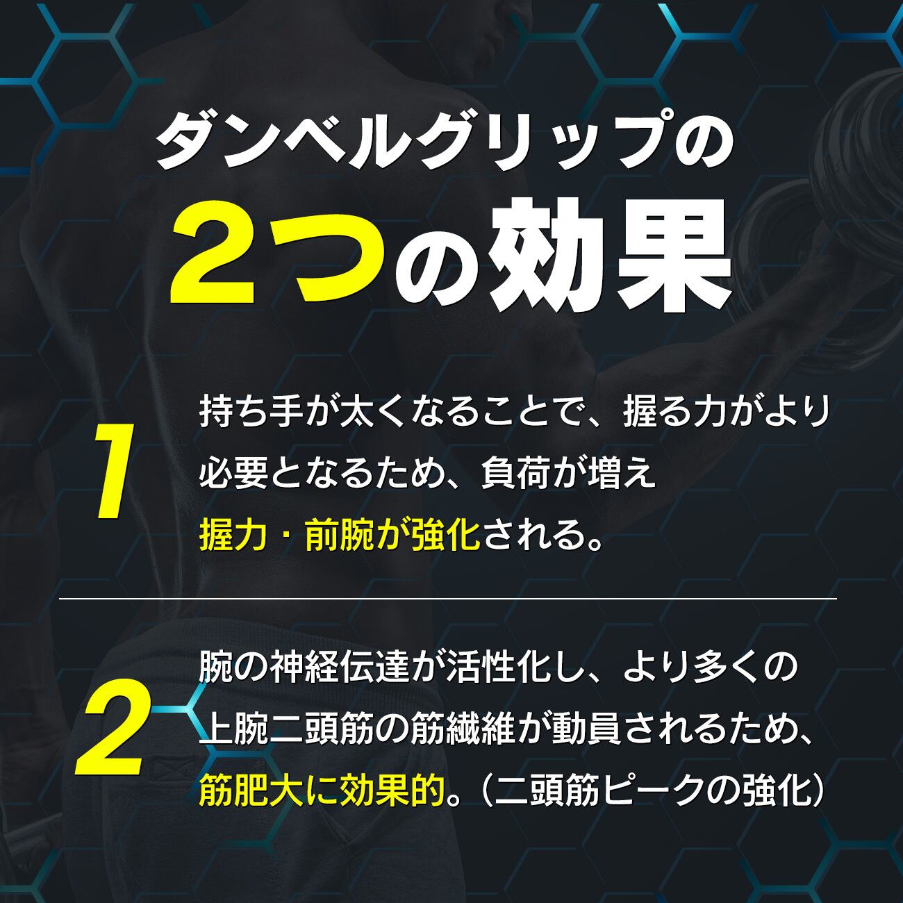 ●ダンベルグリップの効果(2):腕の神経伝達が活性化し、より多くの上腕二頭筋の金繊維が動員されるため、筋肥大に効果的です。(二頭筋ピークの強化)